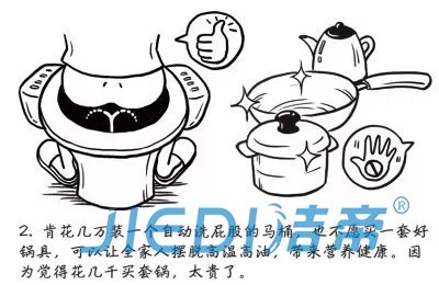 2、肯花几万块装一个自动洗屁股的马桶,也不愿买一套好锅具,可以让全家人摆脱高温高油,带来营养健康,花几千买套锅,太贵了。