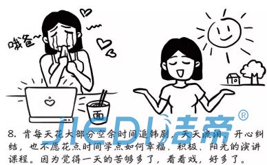 8、肯每天花大部分空余时间追韩剧,天天流泪,开心纠结,也不愿花点时间学习如何幸福、积极、阳光的演讲课程。因为觉得一天的苦够多了,看看戏,好多了。